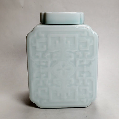 Tea Jar - Rectangular Shape Light Blue Celadon Prunus Flower